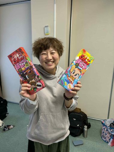 「ちん●すこう」のお土産に喜びを隠しきれないむみさん↓