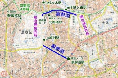 <北参道>⇒代々木駅or北参道駅徒歩5分くらい。裏参道とつながっていて、近くにはあの有名な「手あて整体ここから」がある。